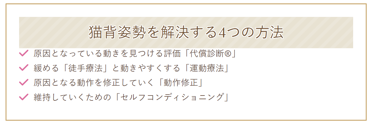 このような姿勢の場合には、丸くなった背骨の丸みを修正していくような取り組みは必要なのですが、そのようになってしまう体の使い方があるので、まずはそこから取り組んでいきます。