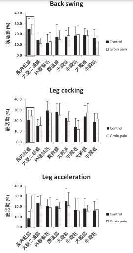 ![]() 鼠径部痛症候群=groin pain syndrome(グロインペイン症候群)とは 「何らかの理由で生じた全身的機能不全が鼠径周辺部の器質的疾患発生に関与し、運動時に鼠径周辺部に様々な痛みを起こす症候群」 今回は鼠径部痛症候群=グロインペイン症候群についてまとめていきます。 グロインペインはサッカーやラグビー、陸上競技などのキックや蹴りだす動作をする競技に多く、 8,490 名のアスリートを対象にした調査によれば、種目別割合はサッカーが約45%と最も多かったとの報告があります。 サッカー選手は状況に応じて様々なキックを使い分けており、あらゆる負荷がかかることからグロインペインの発症のリスクの一因と考えられてます。 グロインペインの分類 MRI等の画像診断はしないで、理学所見のみでの分類方法として、グロインペインに関する臨床的概念を ①内転筋関連のグロインペイン ②腸腰筋関連のグロインペイン ③鼠径部関連のグロインペイン ④恥骨部関連のグロインペイン の4つに分類しています。 グロインペインの主な発生部位として、 内転筋( 64%)、腸腰筋(8%)、腹直筋腱(2%)の順に多いことが報告されています。 先日ブログで書いた症例は①の内転筋関連のグロインペインとなりますね。 グロインペイン既往歴のある選手は 既往歴のない選手と比較して再発の危険性が約2倍高く、グロインペインを発症した選手のうち約26%が再発を経験していたことも報告されています。 また、グロインペインは先にお伝えした通り内転筋が関連する場合が多く、一度発症してしまうと再発する可能性が高く、また改善に向けて時間のかかる障害です。 グロインペイン症候群になぜなるのか?原因は何? グロインペインの原因には以下の報告があります。 上記のことから原因をまとめると、 グロインペインの既往歴の有無と蹴り脚の内転筋の筋力低下、支持脚の大殿筋およびハムストリングス筋力低下、内転筋外転筋などの股関節周囲筋群の筋バランスの崩れにより発症しやすいということになります。 これにはその他の障害におけるリハビリテーション不足や筋疲労、柔軟性の低下、骨盤と体幹の不安定性、 不適切なウォーミングアップ、不良姿勢などが考えられます。 再発防止のためには上記の改善も必要ですが、患部に負担のかからない効率かつ円滑なキック動作の獲得が必要不可欠です。 では、再発防止のためのキック動作とはどのような要素があるでしょうか? 鼠径部に負担をかけないキックフォームの要素 鼠径部に負担をかけないキックフォームの要素として 現JIN整形外科スポーツクリニック仁賀らは、具体的なアスレティックリハビリテーションの中で、鼠径部に負担をかけないためには、協調運動を用いたフォームでランニングやキックができるように再教育することが重要であると述べています。 具体的には以下のように言っています。 ①キックしている時の体幹の軸が安定していること ②軸足の外転筋力が十分であること ③スイングする下肢と上肢が同期してcross motionを行なうこと ④骨盤が垂直・水平回旋すること ⑤両側の肩甲帯を結んだ水平軸と骨盤の水平軸が互いに協調して逆方向へ回旋すること。 既往歴者を対象に行なったインサイドキックの実験では、 ball impact時における股関節内転角速度が速く、膝関節伸展角速度が遅かった。 すなわち、小さい股関節の外転動作や遅い膝関節の伸展動作を速い股関節内転動作で調整していた可能性が考えられるのだ。 上記のような使い方の結果症状が発症したのか、代償動作の結果なのか、は定かではありませんが痛める(痛めた)にはそれなりの使いからの特徴があるようですね。 サッカーのキック動作と筋活動解析を行なった検証では、 長内転筋の筋活動が蹴り脚をテイクバックさせた際に最も高く、この際にグロインペイン発生のリスクが増大する可能性が高いと推察できます。 ![]() キック動作局面はBack swing、Legcocking、Leg accelerationの3 期に分類したが、 局面が進むにつれて、グロインペイン既往歴群の長内転筋の筋活動の値がcontrol群と比較して高くなり、最終的にはcontrol群を有意に上回るという結果となっています。 特に、Leg acceleration期における長内転筋の過活動は、前述(キック動作の特徴)の様相とも関連する結果となっており、control群はキック動作の当初に大きな長内転筋の活動を有していたが、ball impactに向けては、その活動が低下し、むしろ力を抜くようなイメージでキック動作を行なっていたと考えられますし、グロインペイン既往歴群は、体全体の連動を活かしきれていなく、股関節の力に頼った蹴り方をしている可能性があることを示唆しています。 具体的な運動療法について 以下第 27 回日本臨床スポーツ医学会学術集会教育研修講演 8より引用 以下の文章の下に要約していますのでそちらも併せてごらんください。 ===== 鼠径部痛症候群の定義は修正される ~器質的疾患の発生要因を解明して診断・治療・リハビリ・予防を行う
